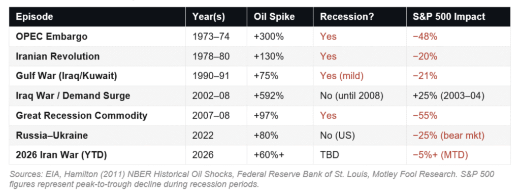 This mechanism is confirmed by historical data. During the four oil-linked recessions, the S&P 500 recorded average declines ranging from 20% (1991) to 48% (1973). The 2026 reaction appears to be following this same historical pattern.